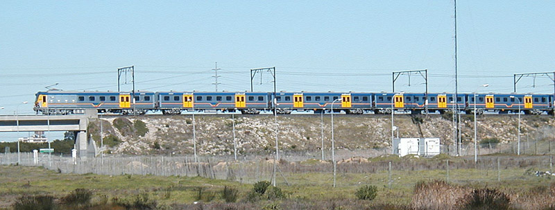 They must have been testing these Metro's on the line running to the docks under Ysterplaat airforce base.The one line is electrified up to Lagoon Beach. Both lines were electrified into the docks. The 6E's would pick up the container trains and head straight for JHB. The cables were stolen and never repaired. Now Diesels take the containers to Bellville where they shunted on to the 6E's. Probably a half a day wasted. The photo was taken from the Canal Walk Road. The train is just about to cross the N1