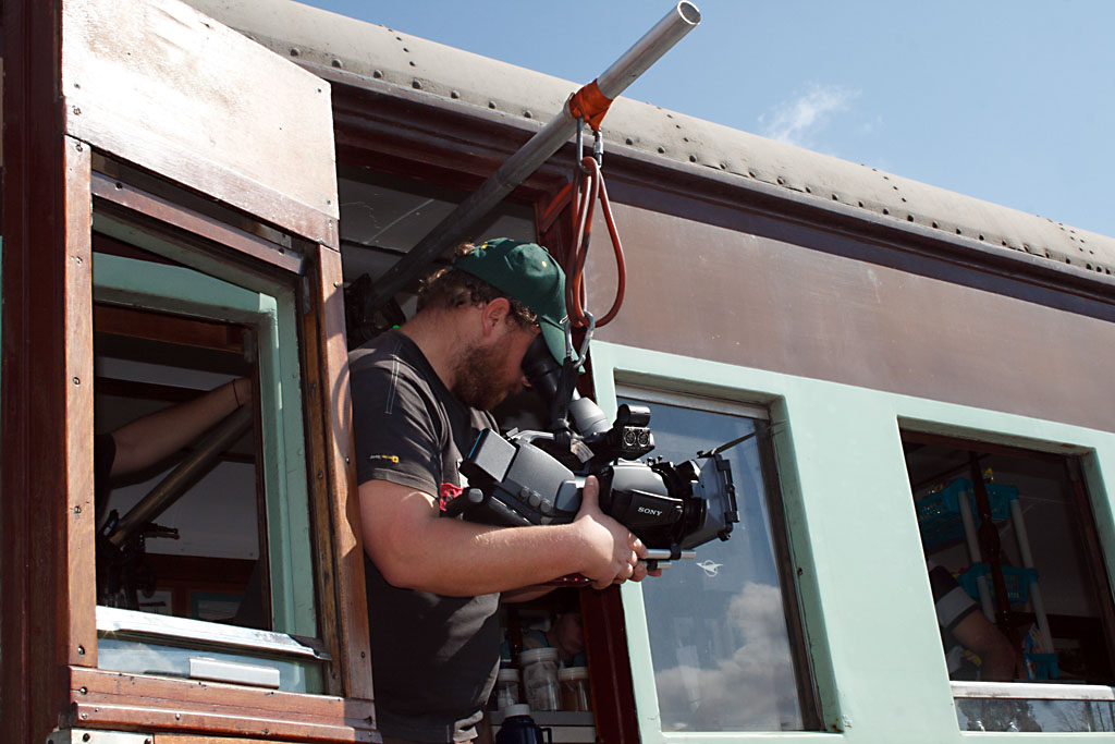 Shortly after arriving in Cullinan, a movie crew set up house next to the station to film scenes on FOTR for the new "flik", Bakgat 2. Here the crew set up and film a short sequence on the bar coach. Pictures: Steve Appleton, June 21, 2009.