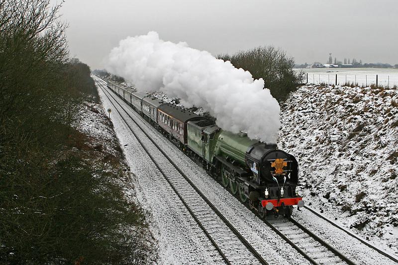 David Rodgers wrote:This morning saw a rather rare event with new A1 pacific No. 60163 'Tornado' taking the Royal Train bringing Prince Charles and Camilla from Preston to Manchester for engagements in the city. The train was routed via the West Coast mainline then east from Parkside along the world's first passenger railway from Liverpool to Manchester - a route earmarked for electrification in the next couple of years. The train is seen between Parkside and Kenyon just past the site of the worlds first railway fatality on the opening day of the L & M railway in 1830. Unfortunately the weather was mega dull (requiring 400ASA) but thankfully the scene was highlighted by a light overnight snowfall.